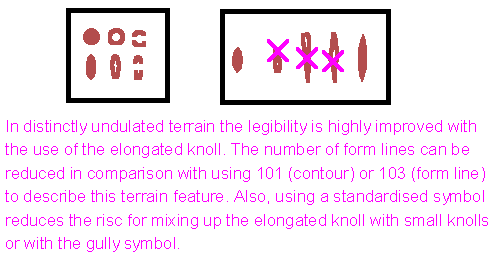 In typical Swedish terrain there is a large need for the use of an elongated knoll. This symbol was included in the specification for maps as a B symbol before 1990. Tries made to use form lined contours have proved to be less successful. In detailed terrain, the legibility is improved using the elongated knoll rather than the contour (101) or form line (103).